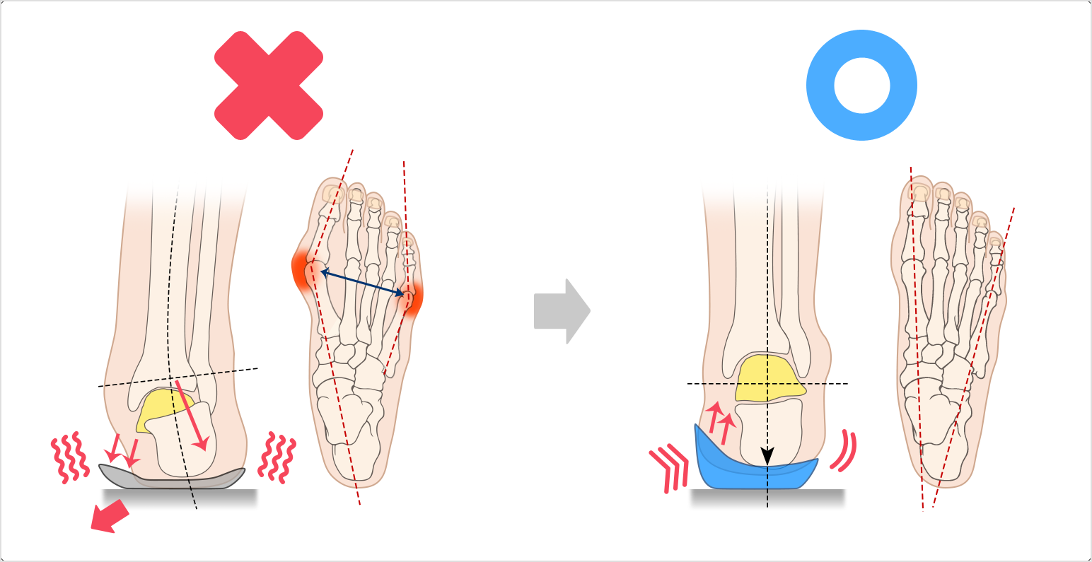 일상생활에서 틀어진 발의 밸런스는 지속적으로 몸의 균형을 망가뜨려 변형을 가져오게 됩니다. 이러한 변형 중 하나가 바로 다리 정렬의 문제이기도 합니다. 흔히 말하는 O/X 다리의 경우 무릎 정렬의 변화로 나타난 경우인데, 발과 발목 및 무릎의 정렬을 개선할 수 있도록 인솔을 지속적으로 착용하게 된다면, 좀 더 개선된 신체 밸런스를 유지할 수 있게되고 변형을 방지할 수 있습니다.